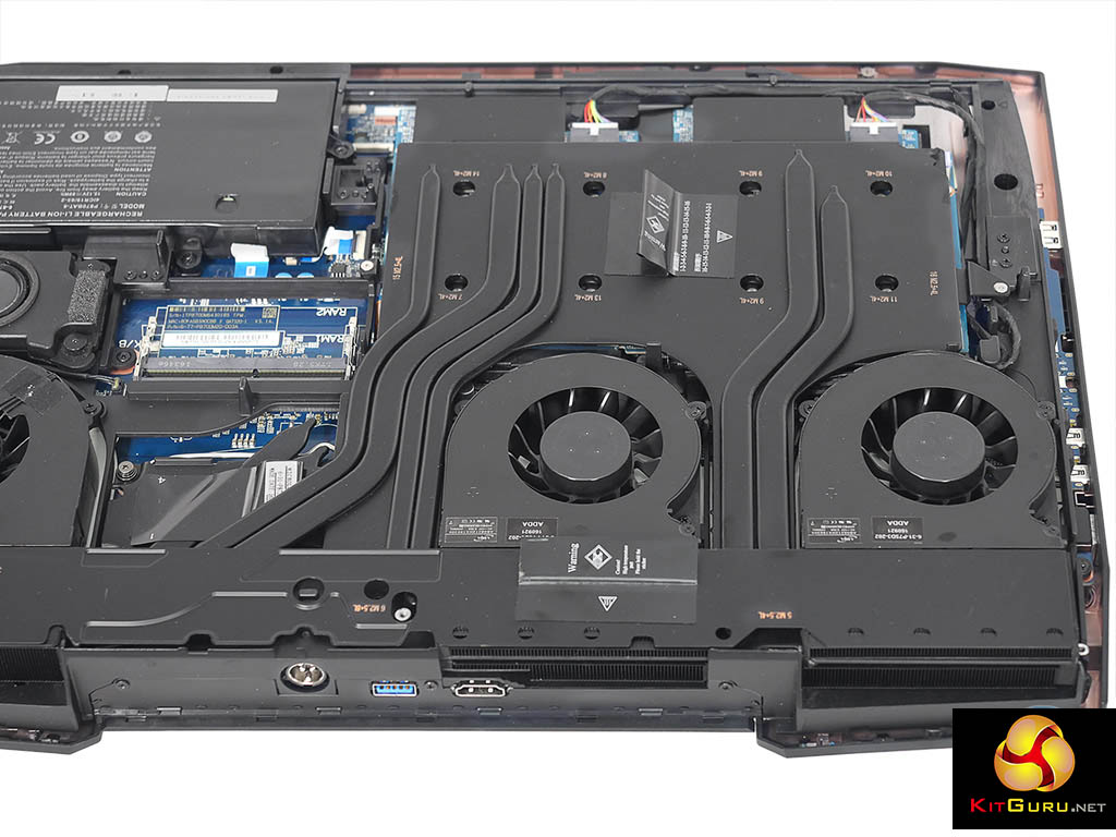 Inside the chassis there is scope for adding storage as there are two hard drive slots and two M.2 slots however our main interest lays in the cooling system. The air intakes are on the bottom of the chassis and they feed air to the triple coolers, one each for the CPU and two GPUs. Each heat sink employs two flat, wide heatpipes to shift the heat to the exhausts at the rear of the chassis.