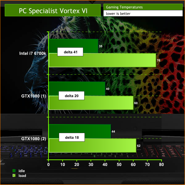 The two GTX 1080s have a base clock of 1,582MHz and boost to 1,771MHz and while pure graphics performance is a little lower than MSI GT80S Titan and Asus GX800VH, the overall performance is greatly assisted by the use of a fully fledged desktop Core i7-6700K. The key point is that the Vortex VI has only five percent lower performance than Asus GX800VH when it is using its liquid cooling dock and the GPUs are boosted to 1,898MHz (which is 120MHz higher than the Vortex VI).