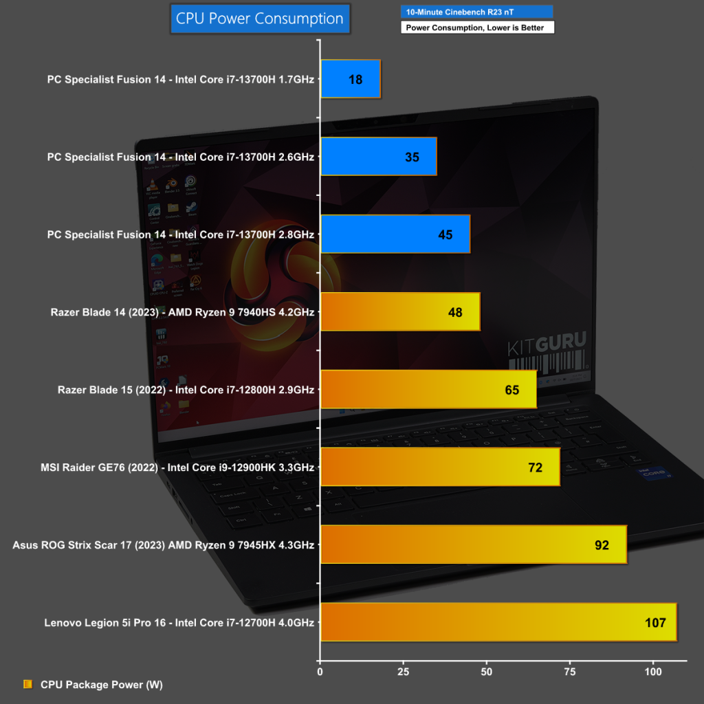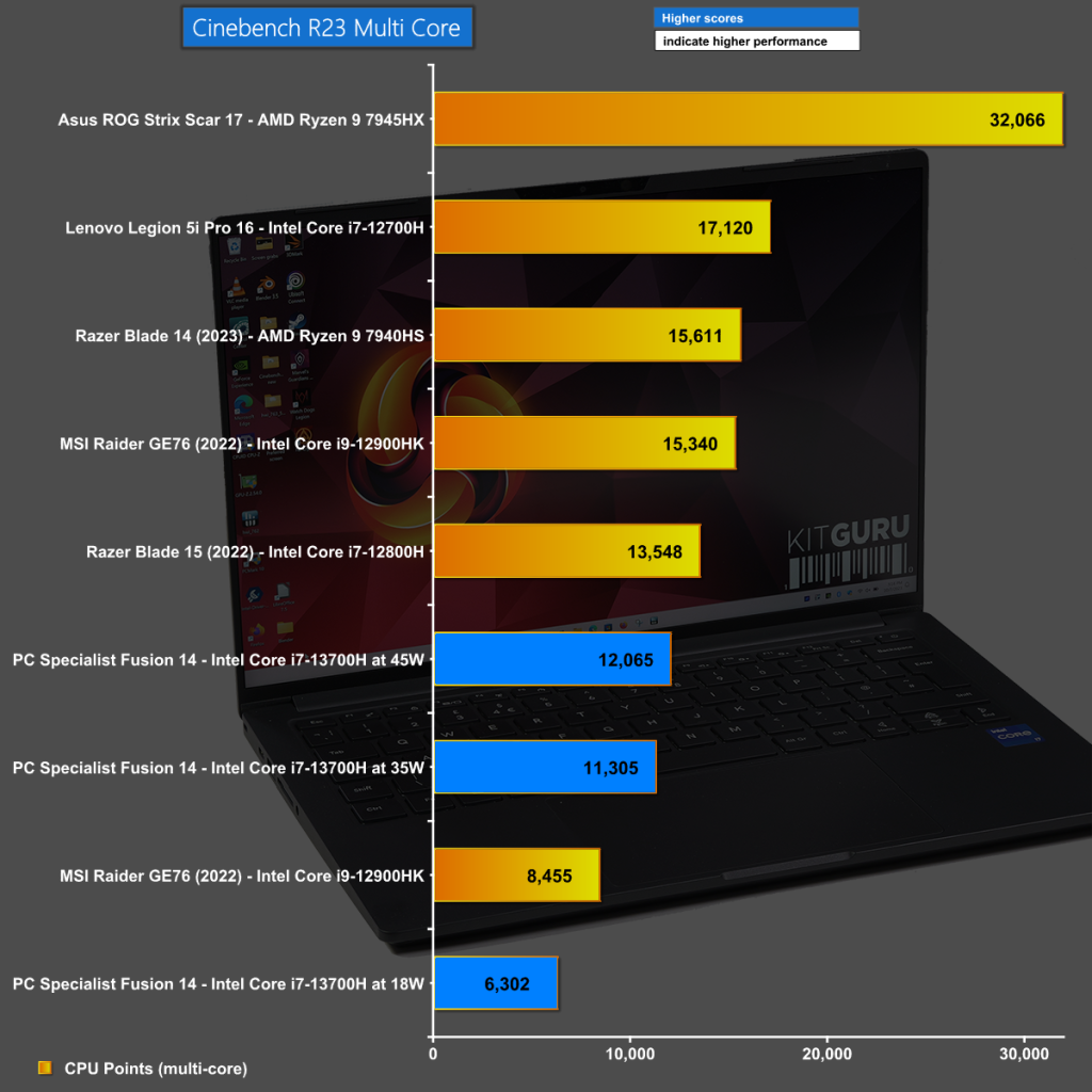In Cinebench R23 Multi Core PCSpecialist 14-inch Fusion is clearly limited by the low power limit that has been set on the Core i7 CPU, in particular in Silent Mode.