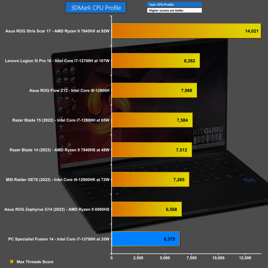 In 3D Mark CPU Profile the Core i7-13700H clearly suffers when it runs at its default of 35W, however it almost keeps pace with the competition.