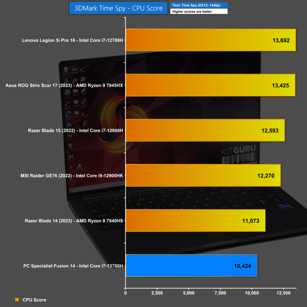 In the CPU element of 3D Mark Time Spy we are laying the groundwork for the next chart. Here we can see the Core i7-13700H does fairly well and almost matches the AMD Ryzen 9 7940HS.