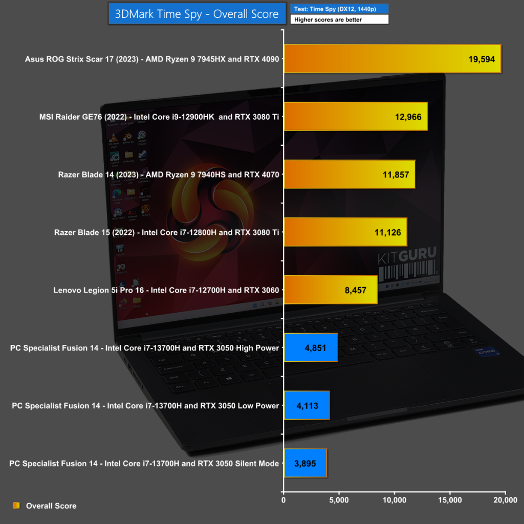 Moving on to the Overall Result within 3D Mark Time Spy we see the scores crash as the impact of the RTX 3050 graphics becomes obvious. There is no suggestion the PCSpecialist 14-inch Fusion is intended for gaming and you may well need to temper your expectations.