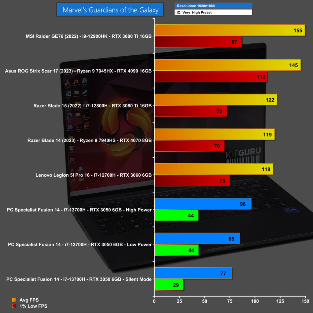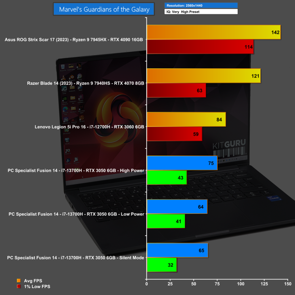 In an apparent contradiction of our statement about gaming on the PCSpecialist 14-inch Fusion, the fact is that you might be able to game, depending on which game and at what settings. In Marvel's Guardians of the Galaxy at 1440p we see average frame rates that are fairly acceptable, although the 1% low figures are less impressive.