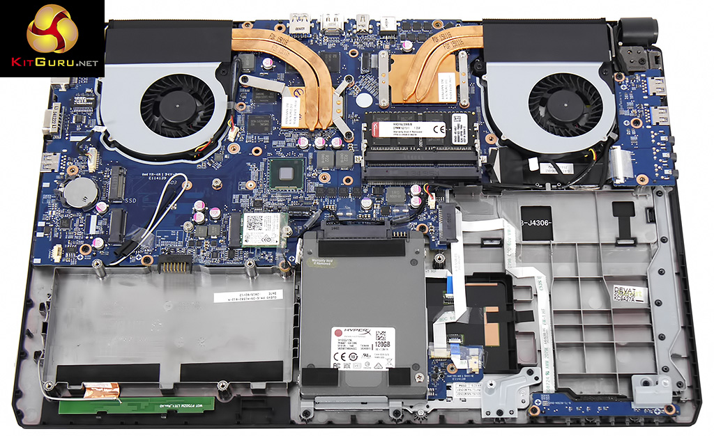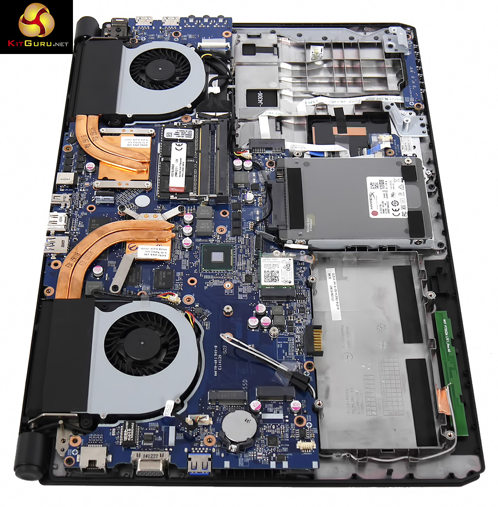 The other point that becomes clear when you look inside the chassis is the way the coolers for the CPU and GPU are separated. The CPU cooler exhausts to the right (as you sit as the keyboard) while the GPU exhausts to the left.