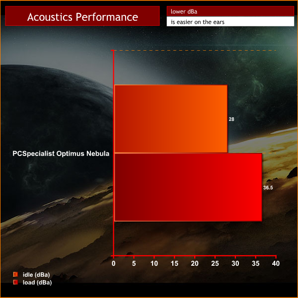 When the Nebula is idling it is pretty much silent apart from the occasional burst of fan noise, which presumably indicates that Windows decided to do some thinking for a moment or two. Under load the fans are quite audible however they are not particularly intrusive. The CPU cooler is slightly louder than the GPU cooler but neither is a cause for concern.
