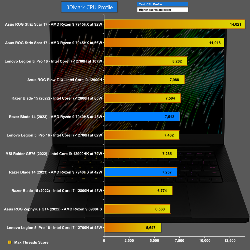 3DMark CPU Profile shows the Ryzen 9 7940HS performing well. When you take its low power draw into account the performance looks even better.