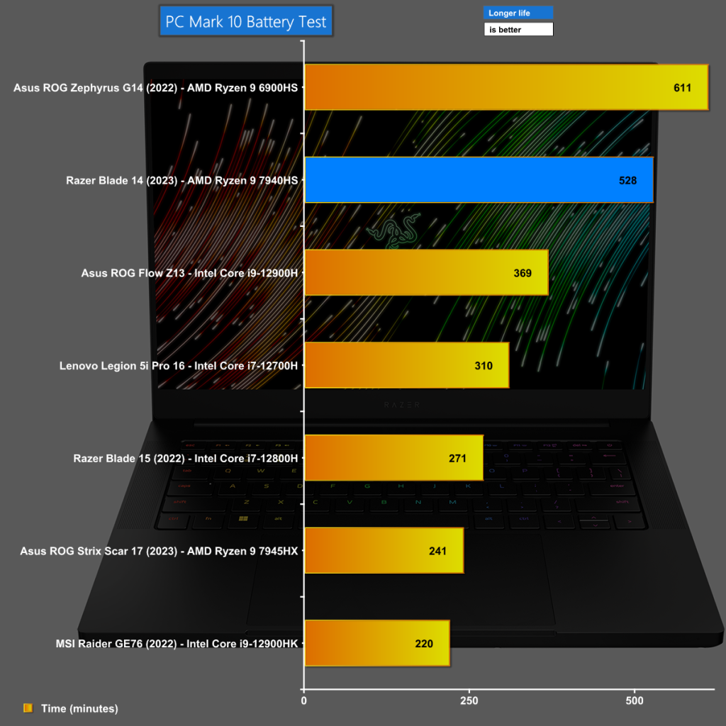 Our PC Mark Battery Test results are truly impressive. The Razer Blade 14 has a relatively small battery rated at 4422mAh/68.1Wh but despite that it can work away for many hours on end.