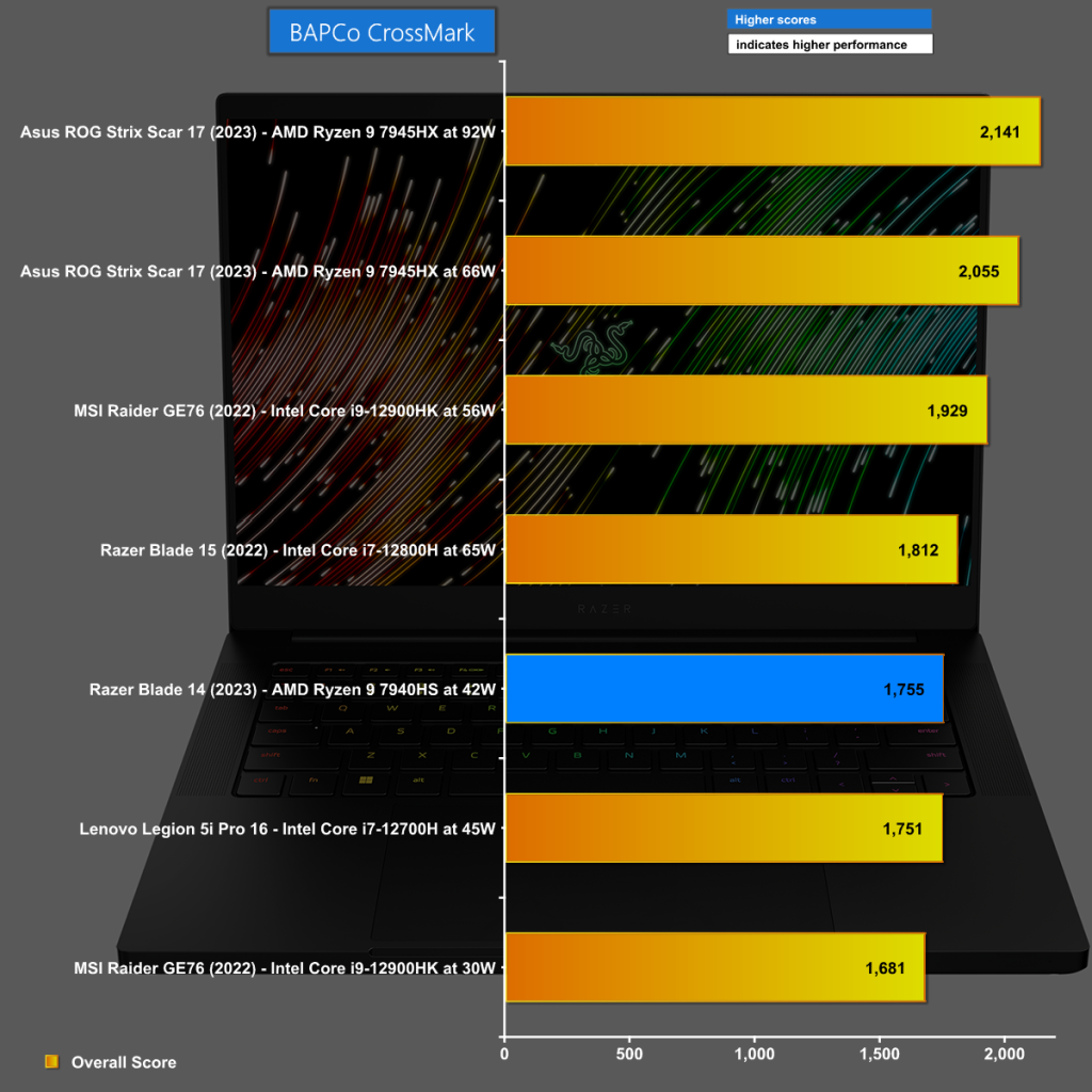 In BAPCo CrossMark the Razer Blade 14 is effectively in a dead heat with last year's Razer Blade 15.