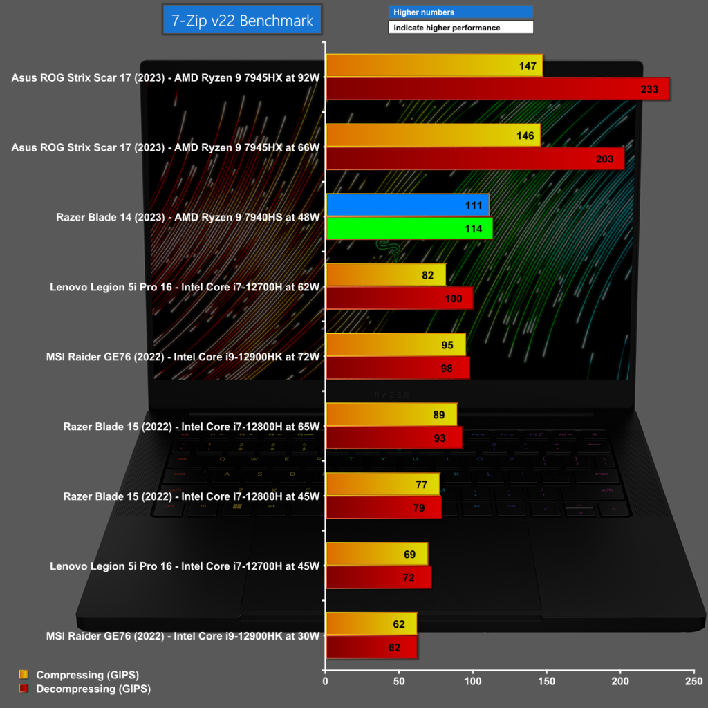 7-Zip v22 Benchmark is a test of pure grunt and the Razer Blade 14 performs impressively well.