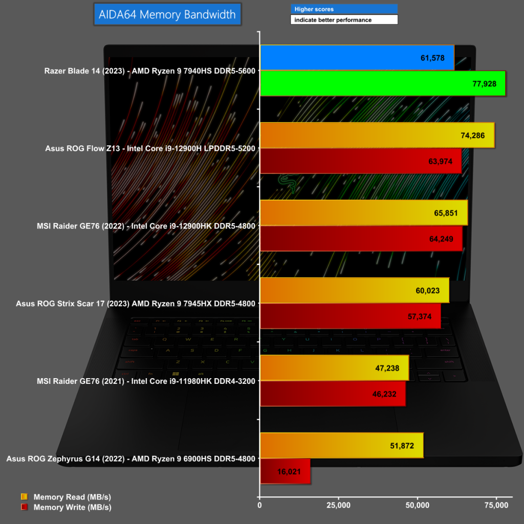 AIDA64 Memory Bandwidth shows the benefit of fast DDR5 memory and the Razer does superbly well. It is worth noting the Write speeds are faster than the Read speeds, which is something we have never seen before.