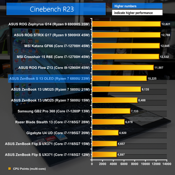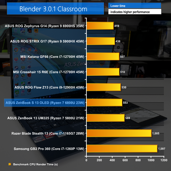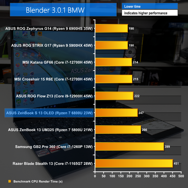 Multi-threaded performance from the Ryzen 7 6800U is very strong. Cinebench R23 is 12% quicker than the Ryzen 7 5800U inside an almost identical laptop. And as we see from the Blender BMW numbers, AMD’s new low-power 6800U isn’t far behind a chassis-restricted Core i9-12900H.