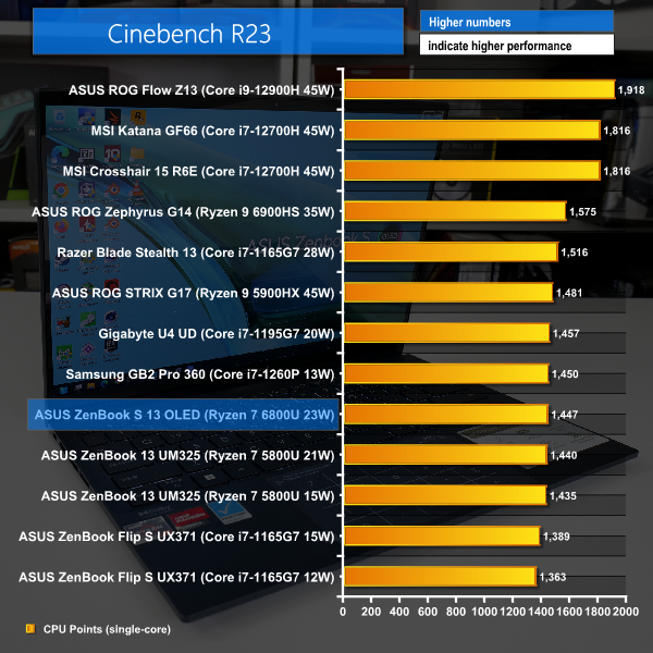 Single-threaded performance from the 6800U is OK, but it’s certainly nothing special. Intel’s ageing Tiger Lake solutions are just as quick and there hasn’t really been an improvement from previous-gen Ryzen 7 5800U.