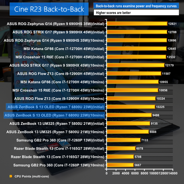 The Ryzen 7 6800U performance is reduced by 7% after 10 minutes of back-to-back Cinebench runs. That’s perfectly reasonable, albeit greater than the performance drop-off seen on the Ryzen 7 5800U solution.