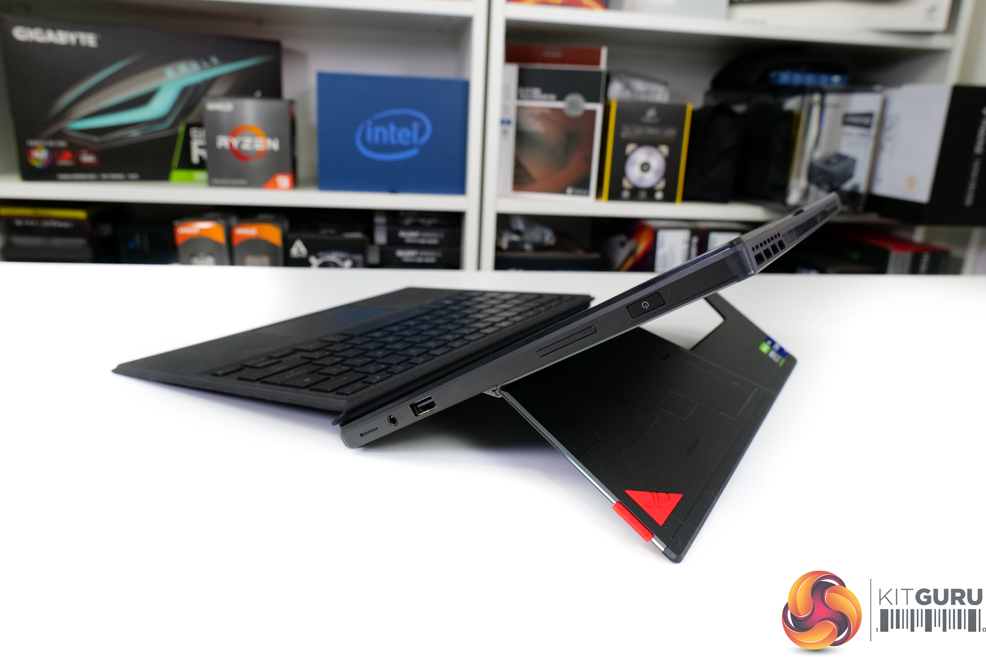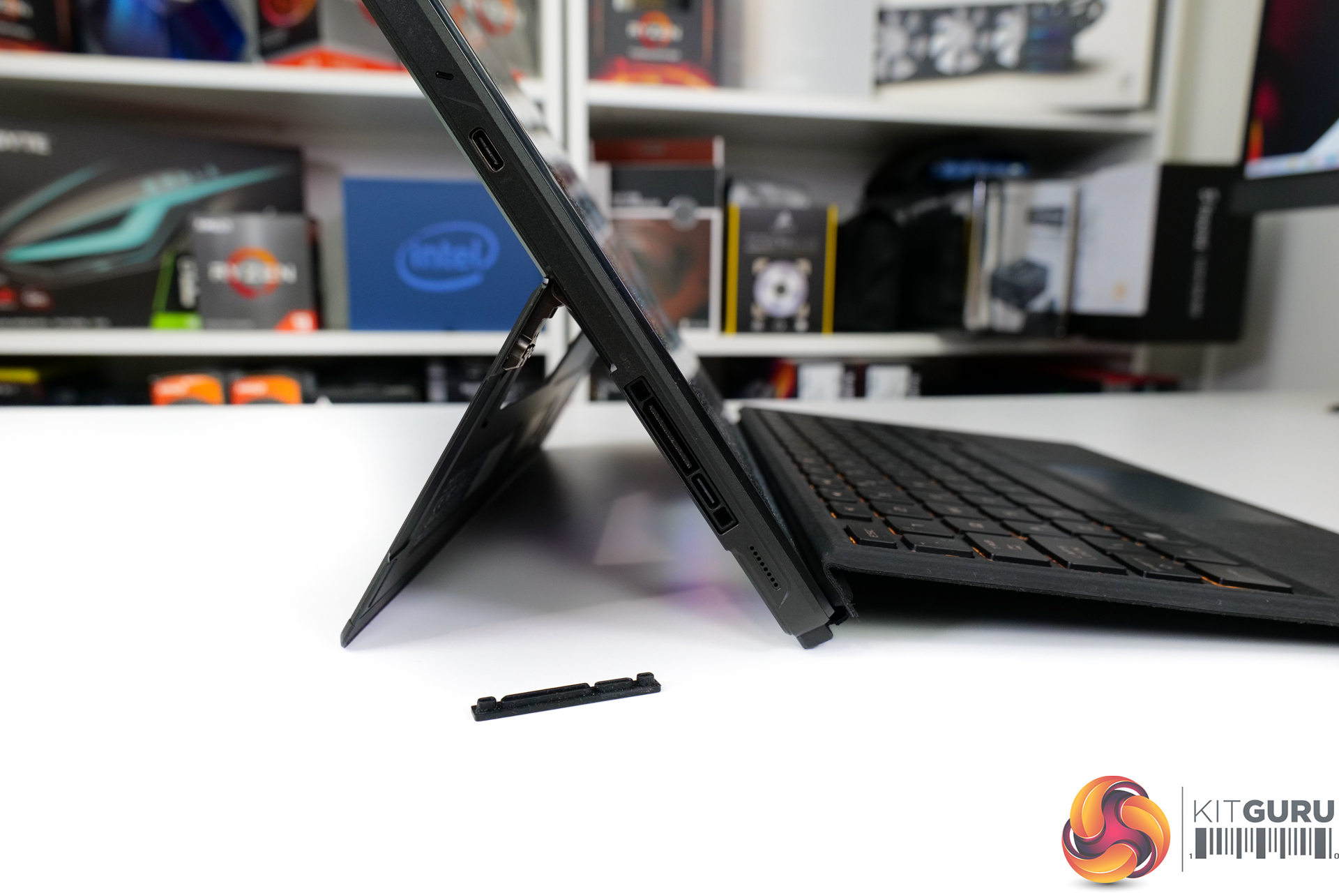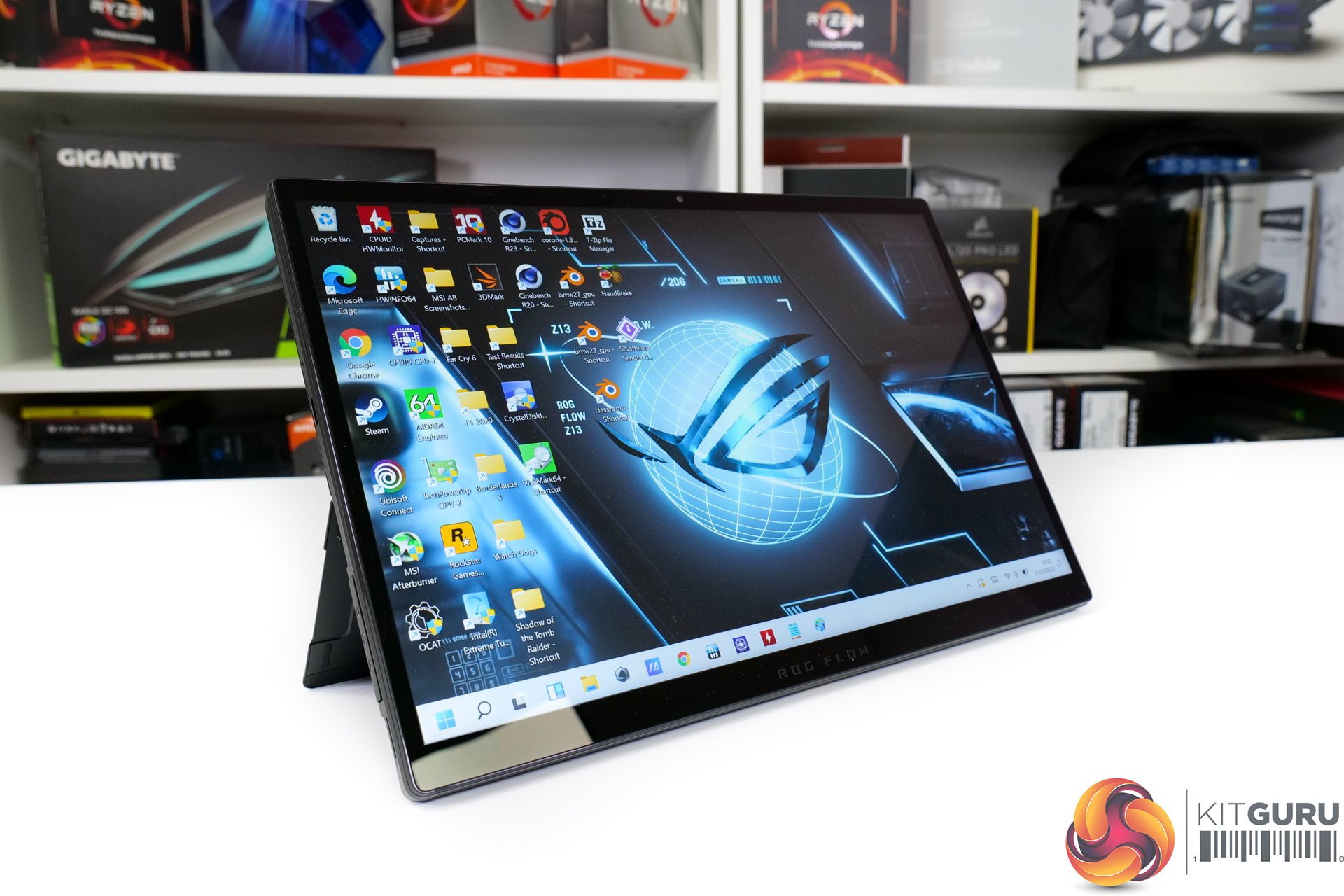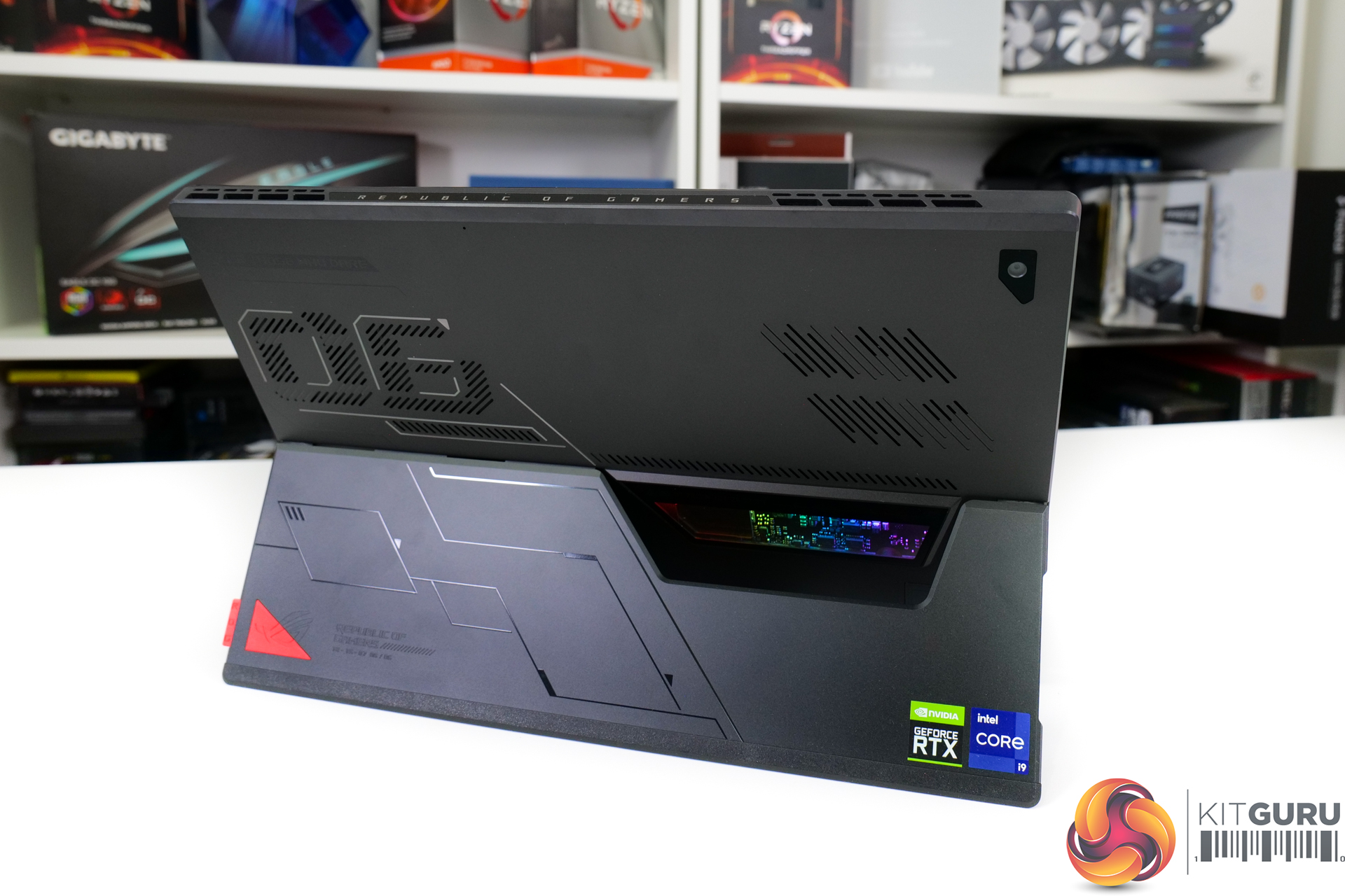 If we start off with the design of ASUS' ROG Flow Z13, the overall form factor is more resemblant of a high-end tablet than a gaming laptop – it certainly blurs the lines between the two. You get a roughly 1.1kg, 12mm-thin chassis that houses the hardware and features a 170-degree integrated kickstand. Cooling holes on the top and back allow for venting of the Vapor Chamber cooling system that is deployed alongside Liquid Metal TIM.