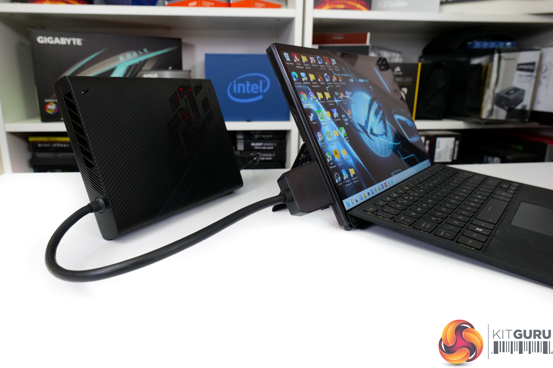 If an RTX 3050 Ti dGPU is a bit modest for some of your use cases, ASUS has you covered. Like we saw from the ROG Flow X13 that we reviewed back in early 2021, ASUS deploys its proprietary ROG XG Mobile connector interface. This is essentially a PCIe x8 link alongside a USB-C connector. ASUS uses this as an alternative to Thunderbolt and its sometimes-limiting x4 lane bandwidth.