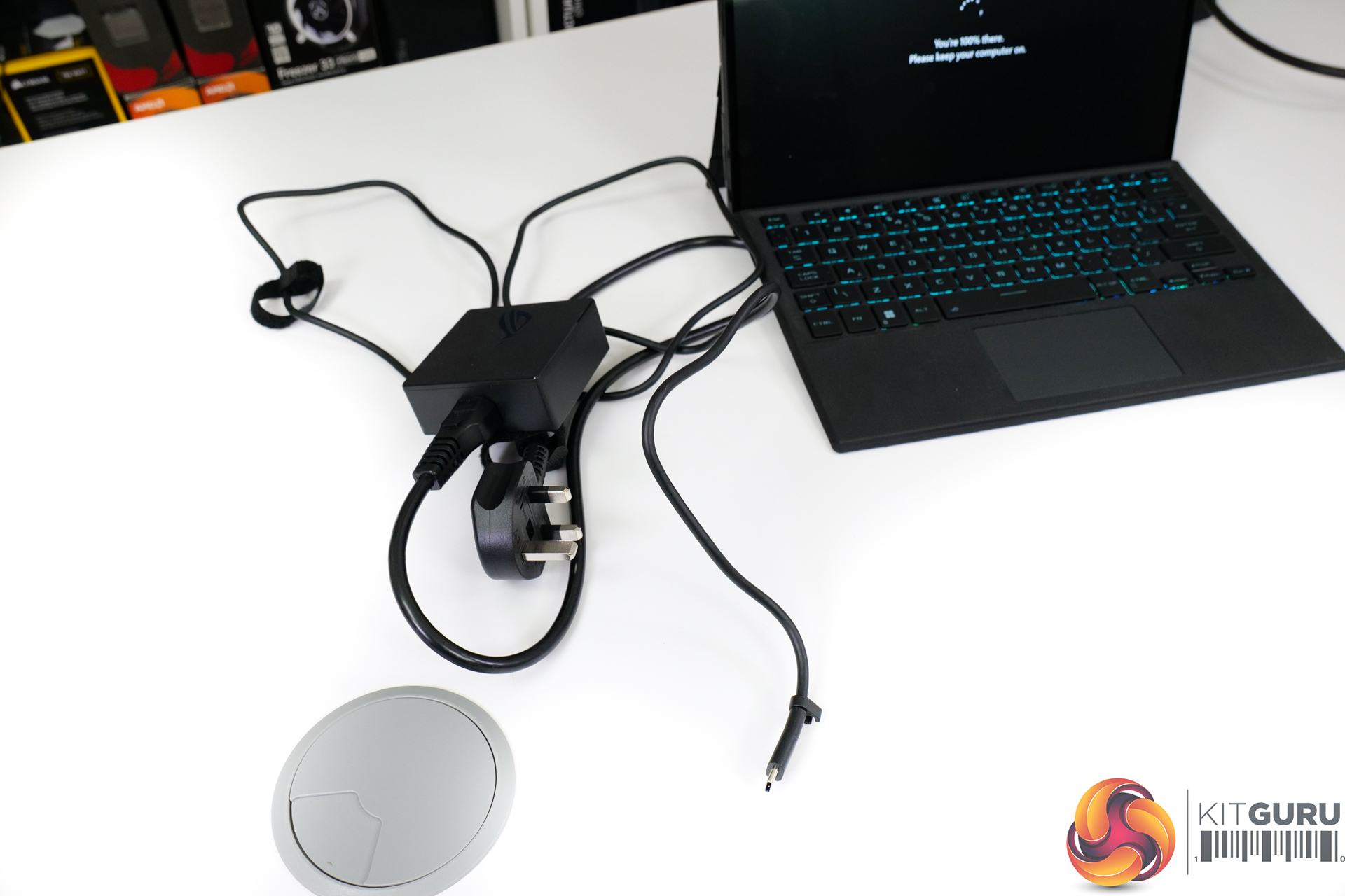 Charging of the 56Whr battery is done by an included 100W USB-C adapter. This is excellent to see the USB-C charging ecosystem being used well.