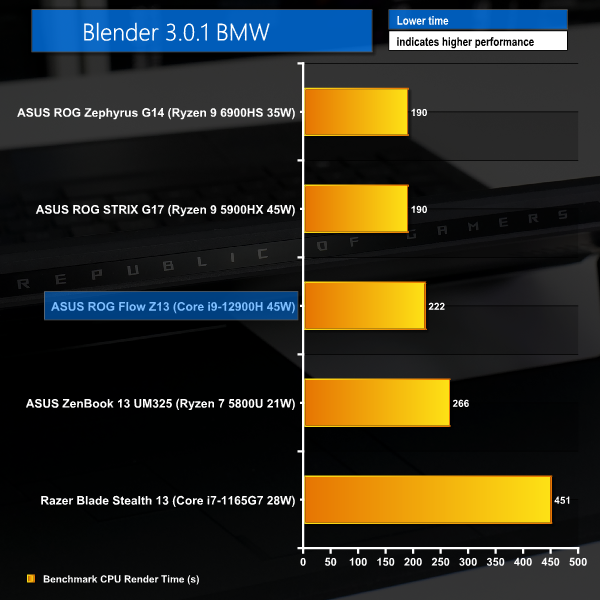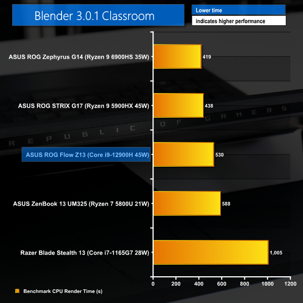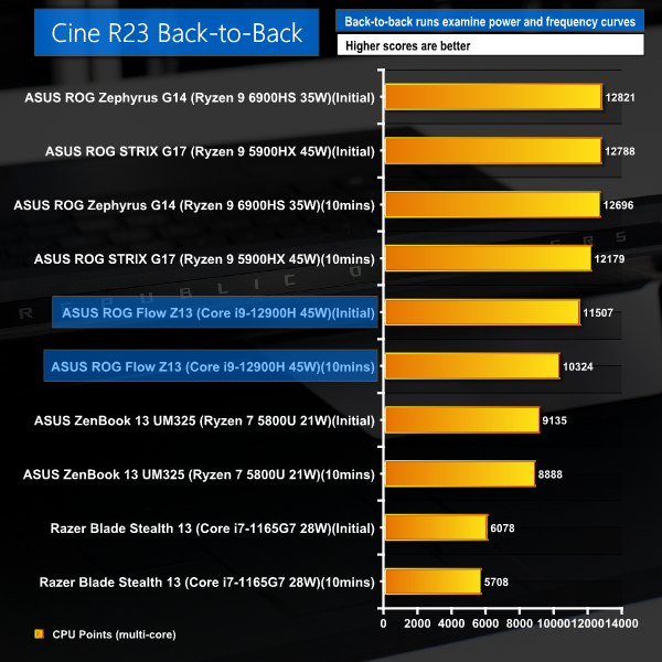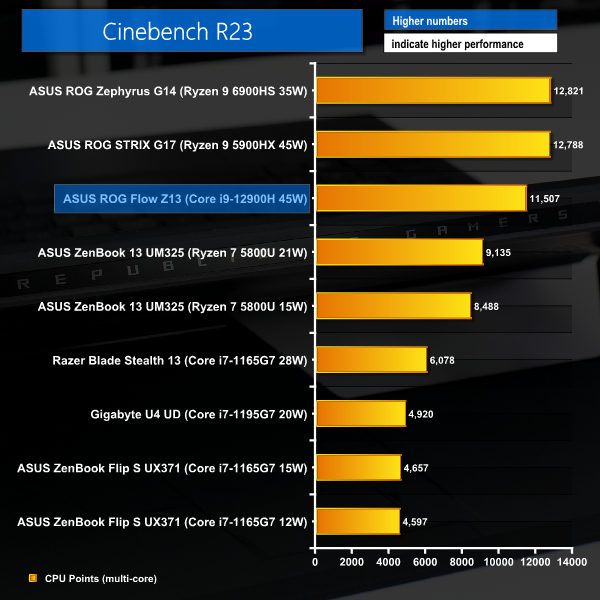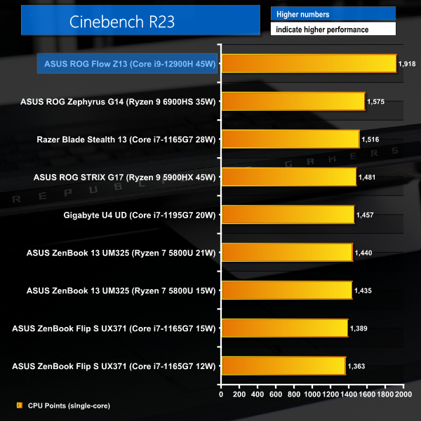 With the ability to boost up to lofty frequencies on its new Alder Lake architecture, the Core i9-12900H-equipped Flow Z13 tops our Cinebench 1T chart by a very sizable margin! That speaks volumes about the lightly-threaded performance potential that is important for this tablet-style device.