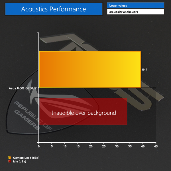 Acoustic performance of Asus' ROG G750JZ is excellent. It was impossible to hear the system's operating state when it was idling.