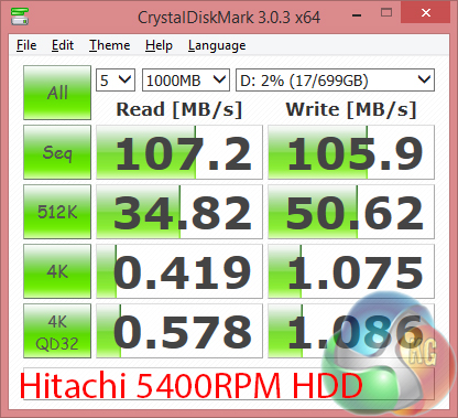 Hitachi's 1.5TB 5400RPM HDD is not going to win any speed contests. It does, however, offer a large storage capacity for a low bill of materials cost. That's not going to please gamers who will rely upon the slow HDD to store many of their games, though.