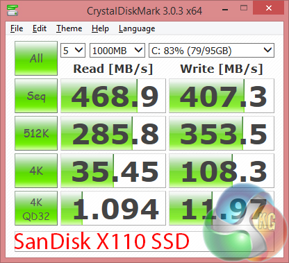 Raw speed of the single SanDisk X110 256GB SSD is slightly underwhelming. Transfer rates do not even put it near the fastest SATA 6Gbps SSDs, never mind the RAID-0 configurations that many competing laptop vendors are employing.