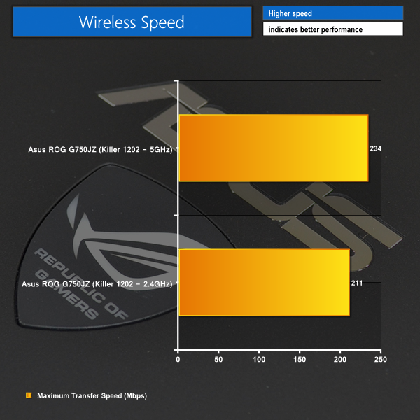 Wireless throughput performance over a home network is sufficient to transfer relatively large files and stream HD media. We registered around 25-30MBps when transferring media from one system to the G750JZ.