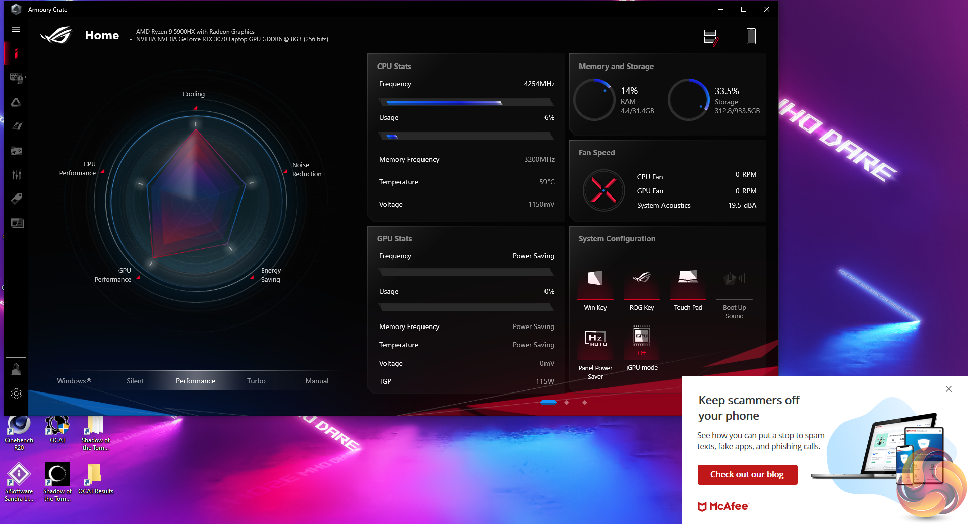 ASUS shipped our sample with Windows 10 Home, though this can no be updated to Windows 11. Serious negative points to ASUS for the annoying inclusion of bloatware such as McAfee – which irritatingly pops up far too often. Thankfully, the annoying ASUS ROG swoosh sound that plays during start-up can be enabled or disabled.
