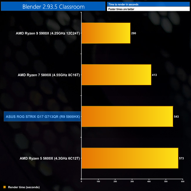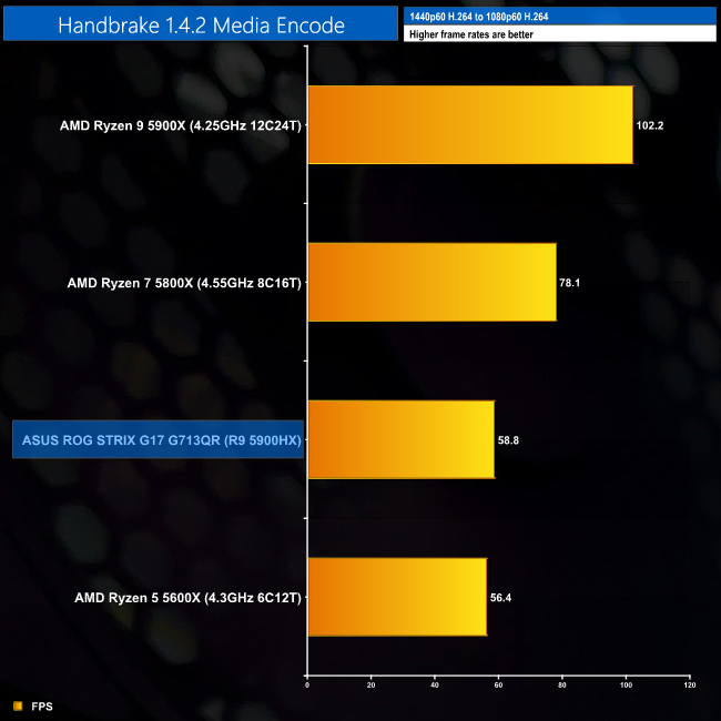 Starting off with Blender performance as compared to desktop Ryzen CPUs, we see the ASUS ROG STRIX G17 and its 8-core Ryzen 9 5900HX sitting just above a higher-powered desktop Ryzen 5 5600X's performance level. Handbrake's performance hierarchy shows the same trend.