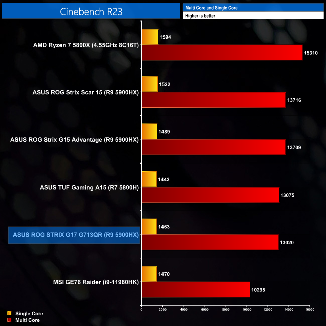 In Cinebench R23, the G17 actually sits a little behind the Ryzen 7-equipped TUF Gaming A15 in our charts. This result is repeatable and is around 5% lower than I would expect from the G17 given the Ryzen 9 5900HX G15's performance. I am pointing the finger at sustained cooling performance or BIOS revisions here.