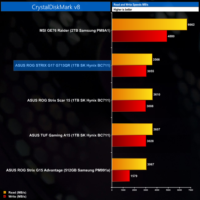 The SK Hynix BC711 1TB NVMe SSD looks to be a reasonable performer. This drive makes logical sense on the G17, as the AMD mobile platform does not support PCIe Gen 4, disappointingly. That highlights why the MSI Intel-based competitor is so vastly superior in terms of SSD performance.
