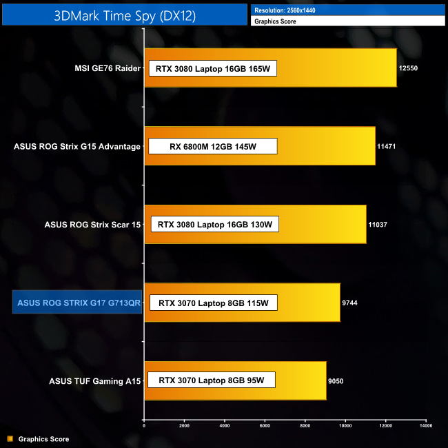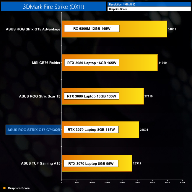 GPU-focussed performance in 3DMark is basically a chart showing the power limits allowed to each laptop GPU. With its 115W TGP, the STRIX G17 sits above the 95W RTX 3070 in ASUS' TUF Gaming A15. But the 130W RTX 3080-equipped ROG STRIX Scar 15 is faster.