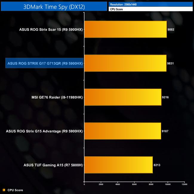 CPU-based scoring for the Time Spy test is an area where the G17 does very well, though. With this CPU test that is clearly less demanding than Handbrake or Blender, the ASUS laptop allows AMD's Ryzen 9 5900HX chip to flex its muscles at the top of our chart.