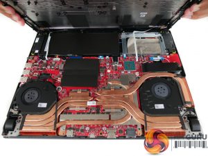 Two blower-style fans take care of the Core i9-9880H CPU and the RTX 2070 GPU, along with a fleet of heatpipes. A pair of SO-DIMM slots takes DDR4 memory and come pre-installed with 2666MHz SK Hynix sticks in our 32GB test configuration. The Intel 660p NVMe SSD is covered with a thermal pad and a thin black cover.