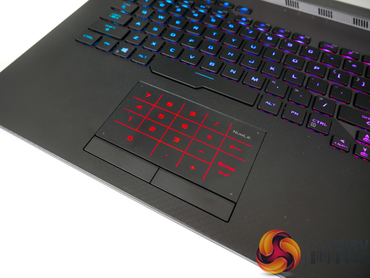 Holding the num lock button on the well-designed track pad reveals the number pad lighting. I am particularly fond of the dedicated right and left click buttons, which are superior to the all-in-one trackpad, in my opinion.