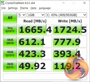 CrystalDiskMark tests the raw speed of a storage device. It uses a test file to write data to or read data from the drive. We test using the default 1GB file size.