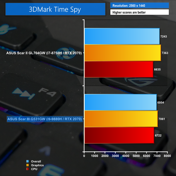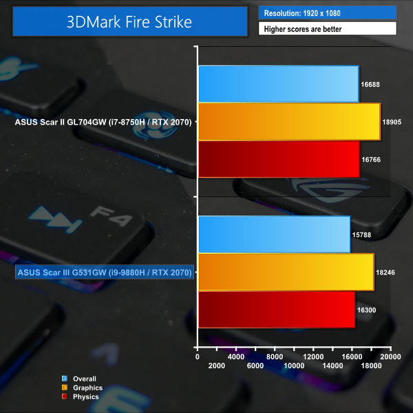 A 3DMark Fire Strike overall score just shy of 16,000 is respectable and is around the expected level for an RTX 2070-equipped laptop. The same can be said for Time Spy.