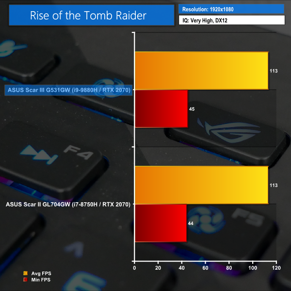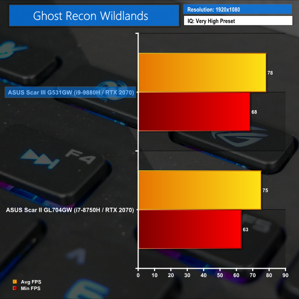 I also enjoyed a session on Battlefield V with the Scar III G531GW and found the hardware to perform well. Dropping the image quality settings to lower levels allowed frame rates to push past 120 FPS. The game looked excellent on the colourful screen and I was impressed by the smoothness of the gameplay at higher FPS levels, despite being well away from the monitor’s 240Hz refresh rate.