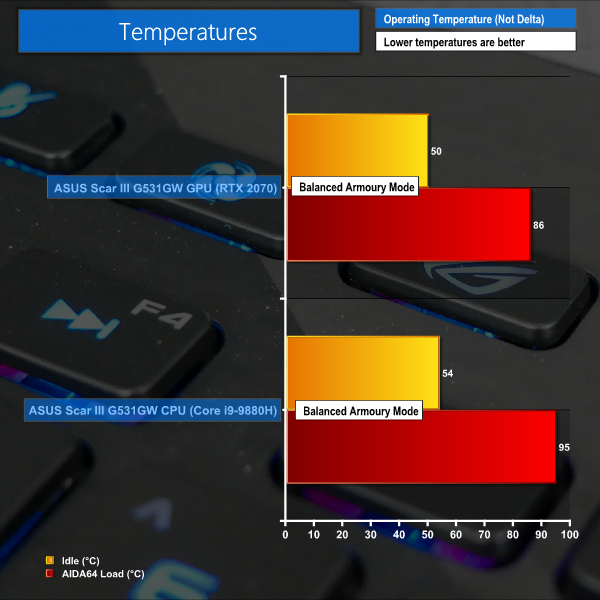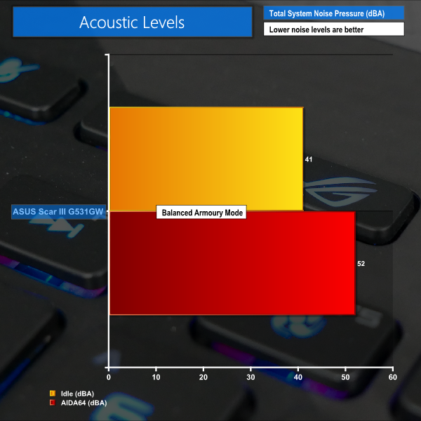 Noise results are recorded using ASUS’ ‘Balanced’ Armoury Crate mode which provides a balance between CPU performance, thermals, and fan speed (GPU performance is largely unaffected). Noise outputs were recorded using a decibel meter positioned where one’s head will be when using the laptop on a desk at a comfortable viewing angle.