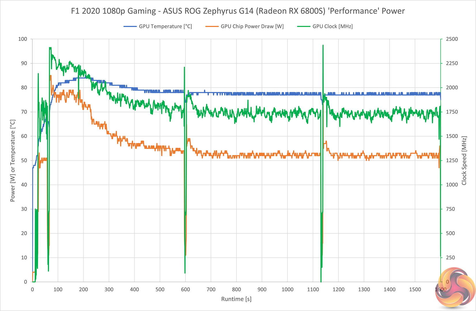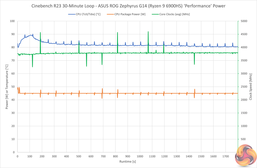 Looking at the chart for temperatures, power, and clocks gives us a good overview of how the Ryzen 9 6900HS processor behaves when loaded under the Performance power mode and without the dGPU.