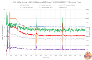 With the system happy to deploy around 70W of power to the CPU and GPU after more than 20 minutes of F1 2020 gaming, ASUS seems to have been smart with the balance; 55W allocated to the GPU maintains lofty frequencies, while the CPU’s modest power allocation is fine thanks to Zen 3+’s excellent voltage scalability.