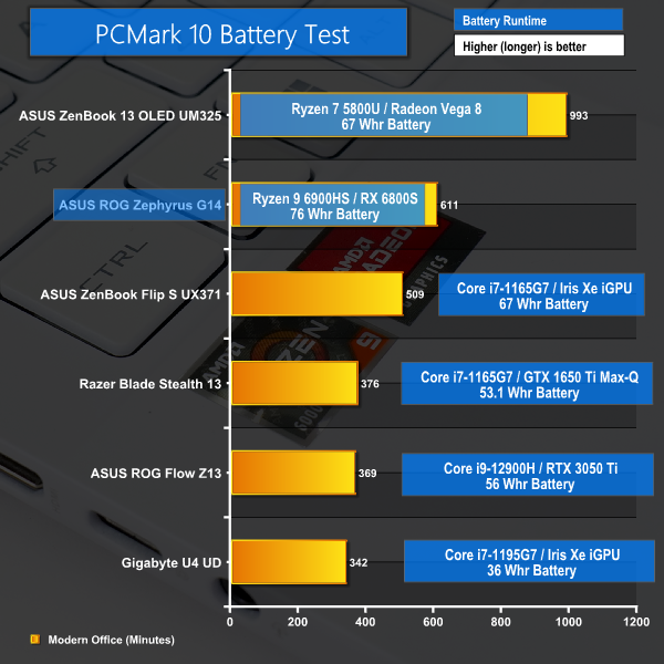 System runtime from the efficient AMD hardware and 76Whr battery is outstanding. We got around 10 hours of runtime in PCMark 10’s battery test, which should translate into about a dozen hours of reasonable system usage. If you want to do some stuff whilst at a solid day of work or on a long-haul flight, the G14 should have no issues powering that.