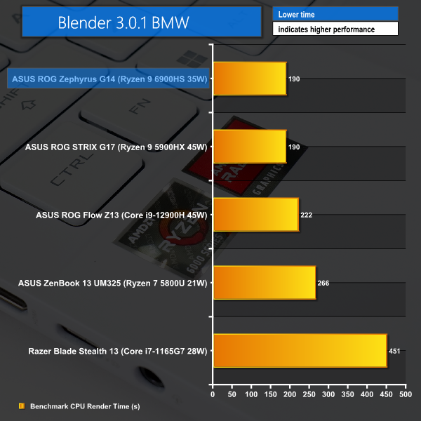 Blender’s short BMW test also sees the G14 and its Ryzen 9 joint-topping our chart. Here, the new Zen 3+ HS-series chip beats out the Core i9-12900H inside a comparable chassis.