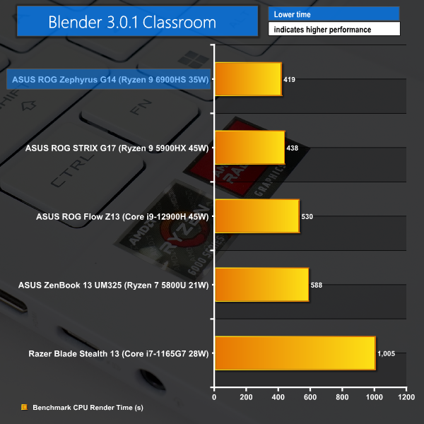 The longer Blender Classroom test sees the 6900HS laptop cement its position at the top of our chart thanks to clean, consistent power delivery from ASUS.