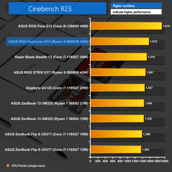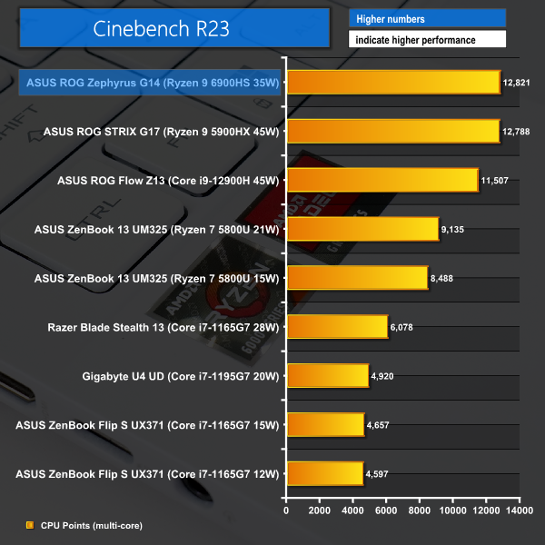 Heavily multi-threaded performance from the Ryzen 9 6900HS boosted to 45W under SmartShift Max is excellent. In fact, this setup matches a Ryzen 9 5900HX inside a much better cooled 17-inch laptop.