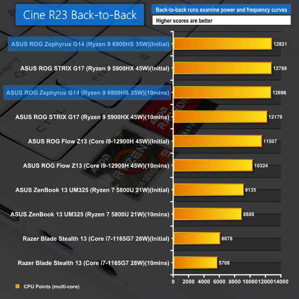 Performance consistency from the Zephyrus G14 is excellent; barely any Cinebench nT scoring is lost after 10 minutes. This is no surprise given the clean 45W and roughly 3.8GHz operating throughout our extended CPU load testing.