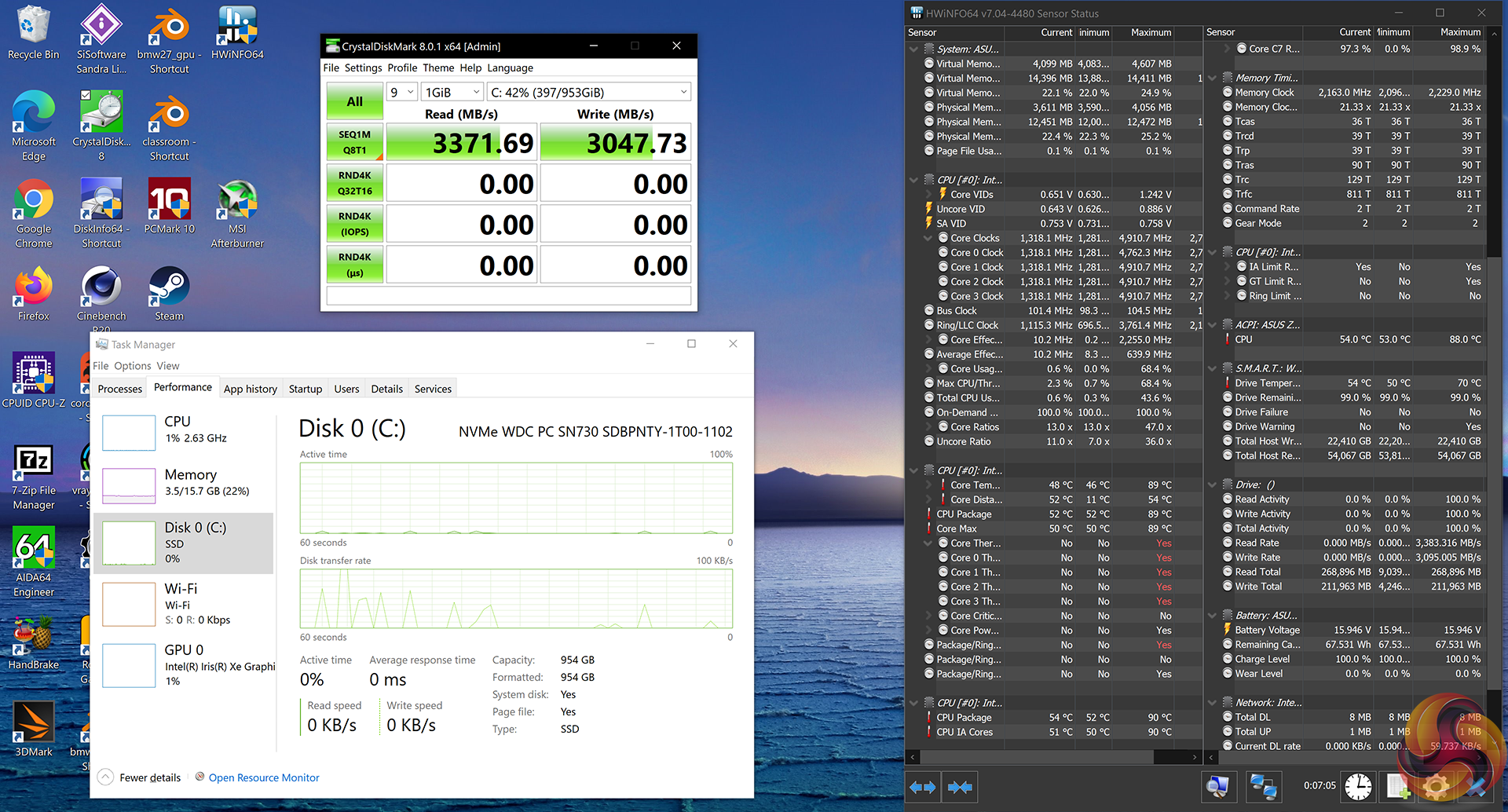 ASUS deploys a better WD SN730 SSD on the Intel system. The AMD laptop’s SK Hynix 1TB drive does, however, hit 3GBps writes. Thankfully, neither drive had cooling issues even with heavy sustained loads.