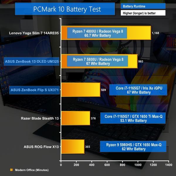 The Ryzen 7 5800U ZenBook 13 and its 1080P OLED display can do over 16 hours of usage in PCMark 10’s testing, which will actually translate into a little more in the real world. That is very impressive indeed.