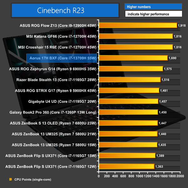 Perhaps it’s the influence of the power profile that we selected, or early system and Windows drivers. But there was a clear deficit for the Aorus 17H in our testing when compared to some previous-generation processor models.