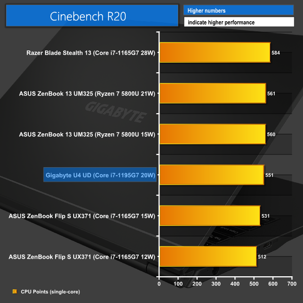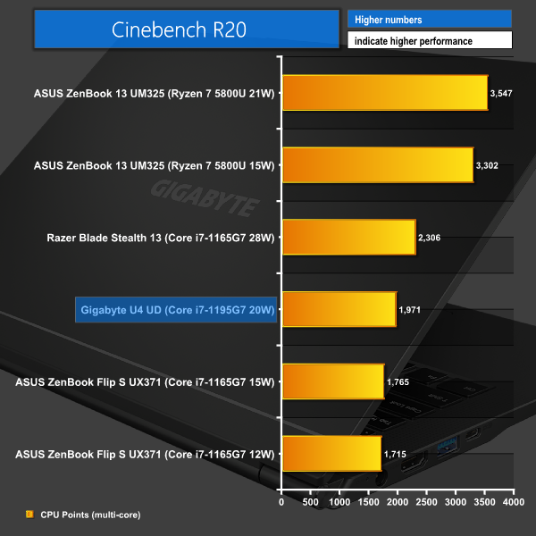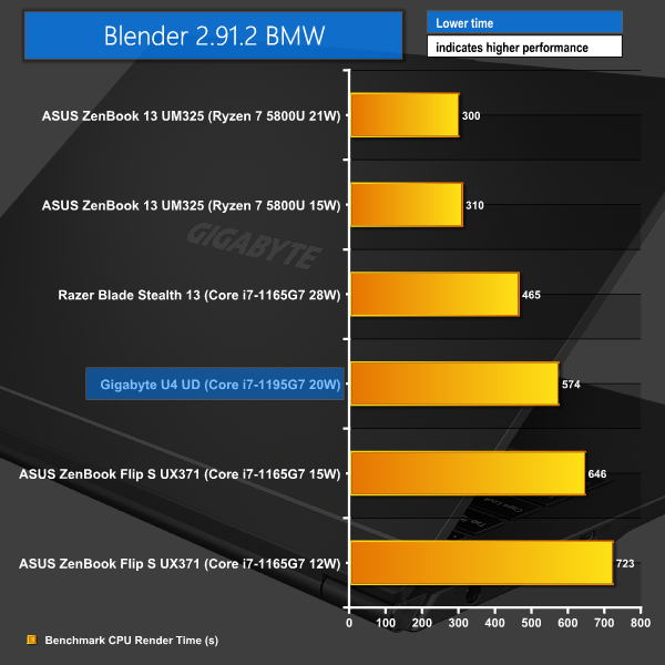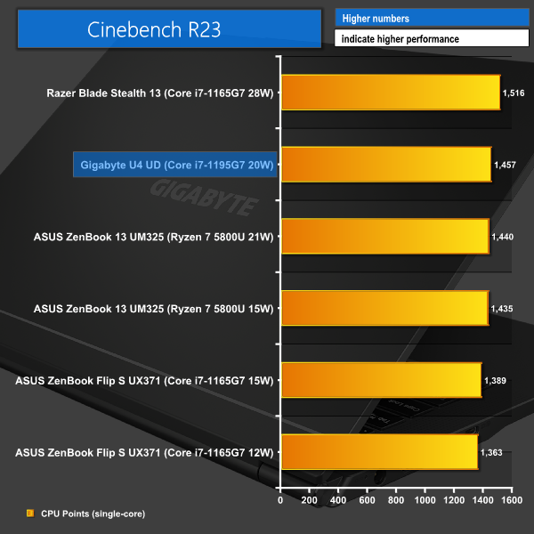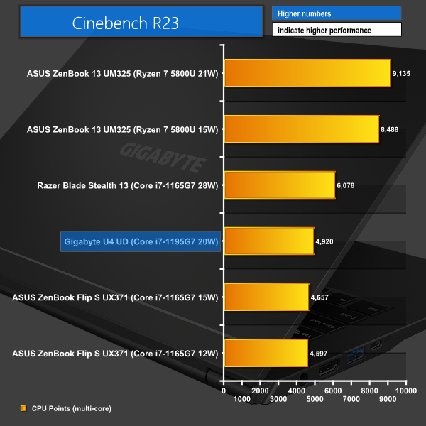 In Cinebench R20, we see performance that is very close to that of the Ryzen 7 5800U – an eight-core processor that has wiped the floor with the Tiger Lake-based chips in heavy workloads thus far. But Gigabyte’s chosen 20W PL1 and 51W PL2 values prevent the U4 UD from taking top spot in the Cinebench R23 benchmark.