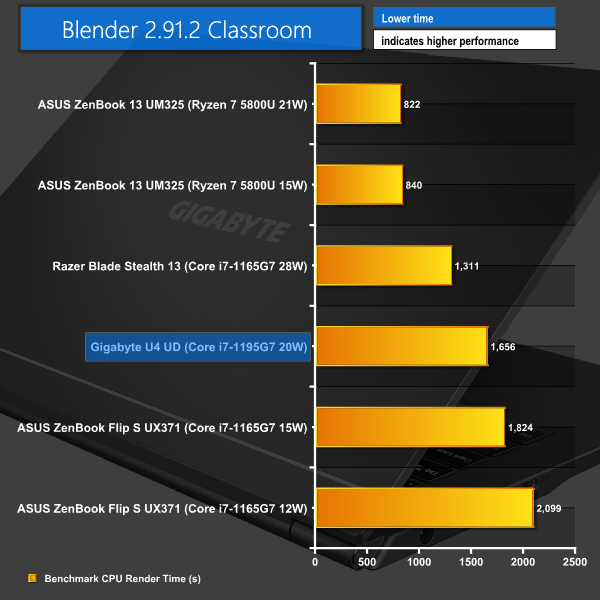 Heavily multi-threaded performance is, in essence, a showcase of the power budget that Gigabyte allocated to the U4 UD laptop’s Core i7-1195G7. The 20W long duration chip sits between the 15W and 28W Core i7-1165G7 processors in typical scenarios from the competitors.