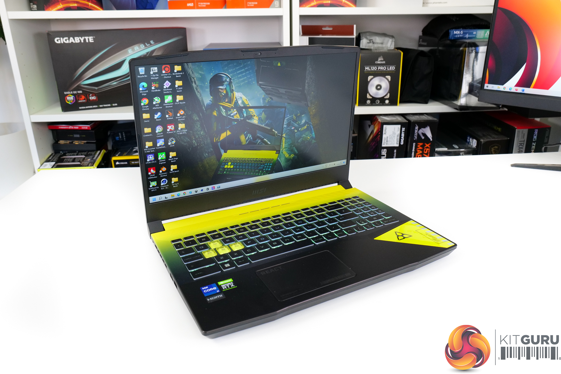 The keyboard backlighting is inspired by Rainbow Six Extraction game colours, with three step of brightness and a completely off option. MSI uses green for the lower third, blue for the middle third, and yellow for the upper third. The WASD keys are presented in a different style though.